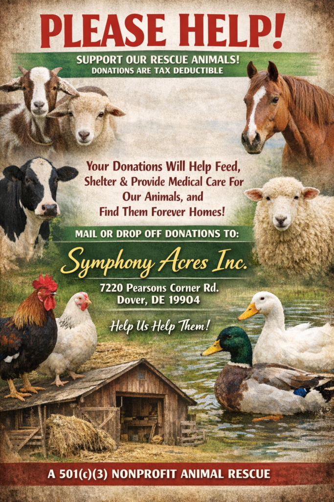 Symphony Acres Inc is a 501(c)(3) nonprofit organization dedicated to rescuing unwanted, injured or ill farm animals and providing educational opportunities for children and young people in Kent County, Delaware. Our mission is to create a harmonious environment where rescued animals and the community come together to learn, grow, and thrive. At Symphony Acres, we believe in the power of compassion, education, and community involvement to make a difference in the lives of animals and people alike.